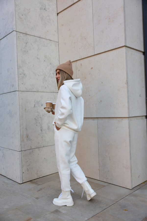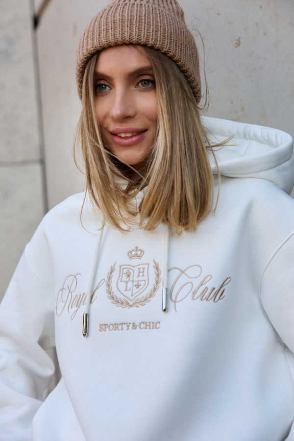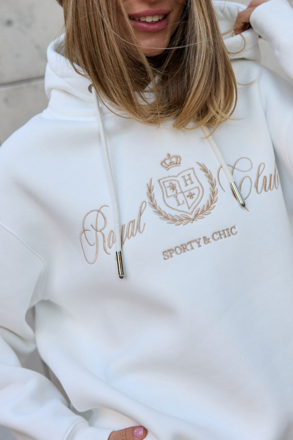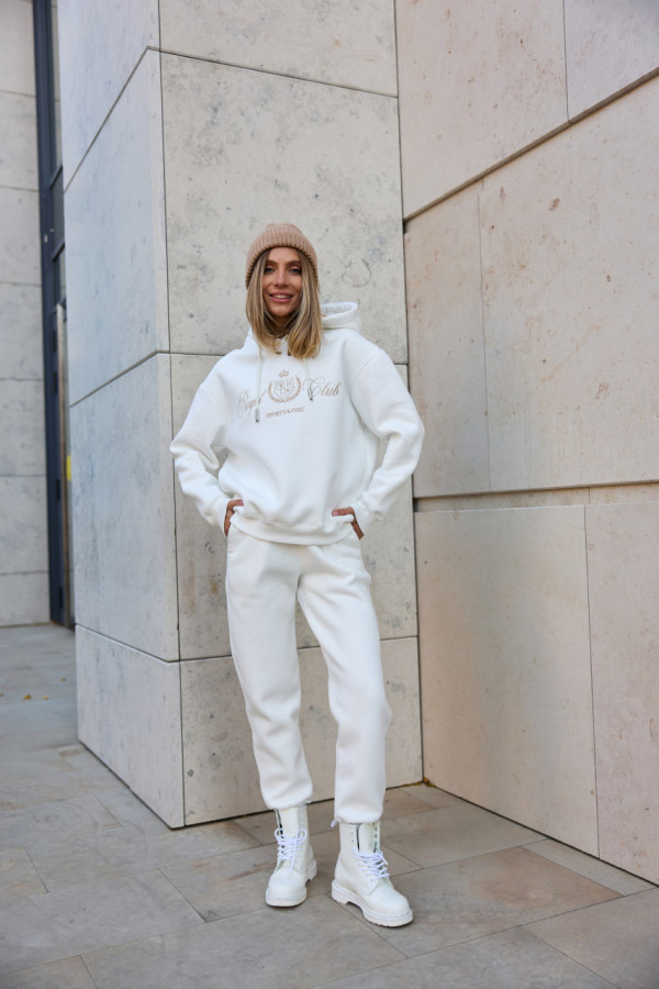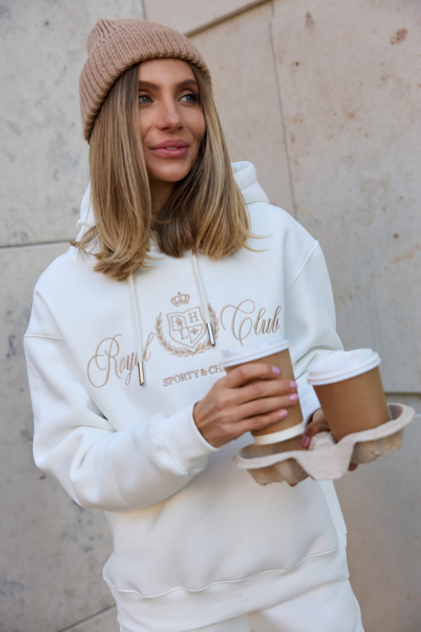 Костюм з м’якого трикотажу у молочному відтінку, що складається із худі та джогерів. Худі має манжети та нижній край на резинці для зручної посадки, прикрашене бежевою вишивкою Royal Club · Sporty & Chic. Штани джогери з поясом на резинці зі шнурівкою та манжетами.
